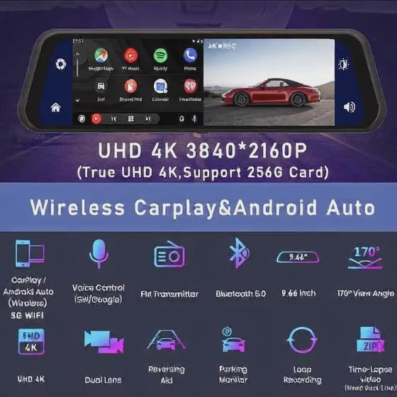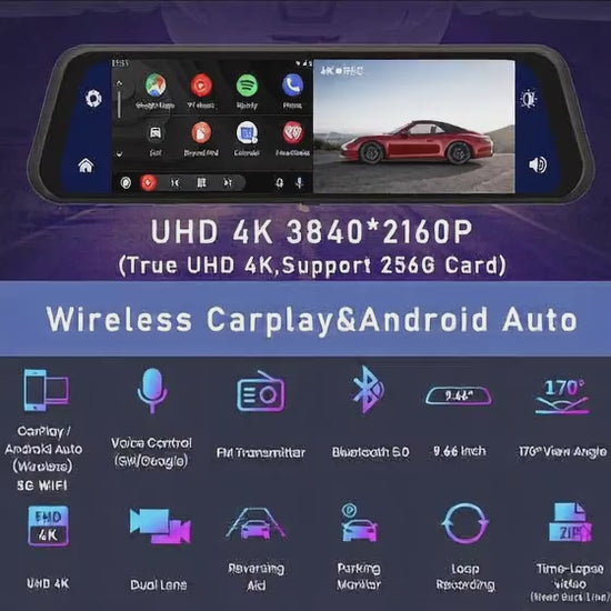 Drive safer with this 12-inch 4K Mirror Dash Cam. Features WDR night vision, CarPlay & Android Auto connectivity, loop recording, parking monitor, and G-sensor.